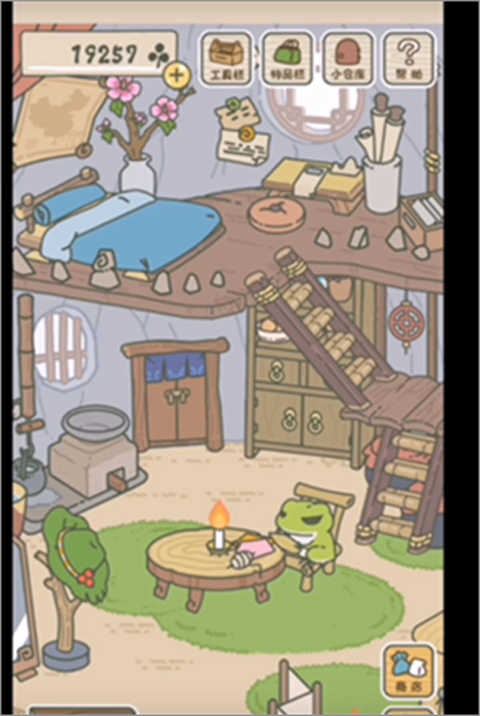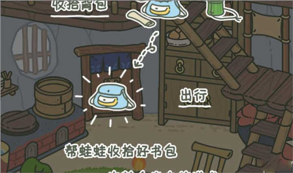 然后我们点击右下角的“房子”返回房间里,在房间里点击左下角的“收拾”按钮,开始为青蛙准备旅行的行李。