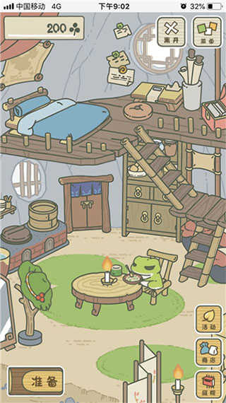 4、然后我们点击右下角的“小屋”返回房间里,在房间里点击左下角的“准备”按钮,开始为青蛙准备旅行的行李。点击行李中空白区域,放入便当、护身符等,就可以点击完成了。然后我们的青蛙就开始出去旅行了。