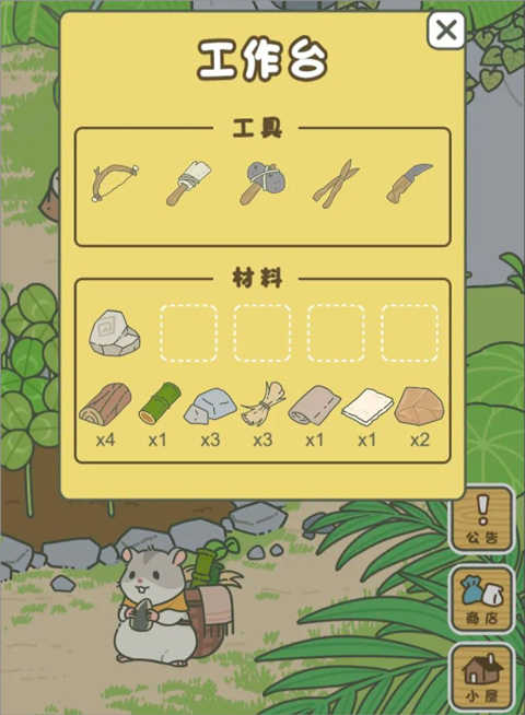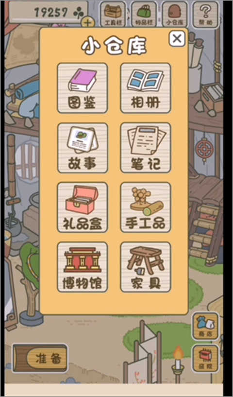玩家获得材料和工具后点击右上角的菜单选项,选择小仓库;