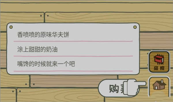 1、进入游戏后,我们将来到一个童话世界,主角是一只喜欢旅行和冒险的青蛙。在旅行之前,我们要帮它准备旅行所需物品,主要是便当、护身符、道具等三种,当然其中最基础的是食物便当,购买食物需要三叶草才行,我们点击右下角的“庭院”按钮进入庭院。