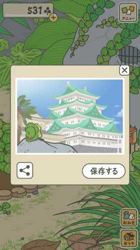 6、过不了多久,青蛙就会旅行回来了。回来的时候,青蛙会将旅行的见闻拍成照片,也会带回来一些旅行中收集到的特色物品。照片会保存在相册中。也会寄一些礼物回来,包括当地的纪念品或者特产。特产和纪念品也会保存在我们的小仓库中,通过不同的旅行,青蛙还会获得一些旅行称号。