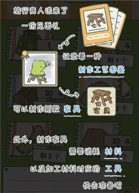 玩家购买了工艺手册和购买了对应的工具材料后,蛙崽就会在未外出旅游时随机制作一款家具,制作好的家具会按照蛙崽的意愿进行摆放。