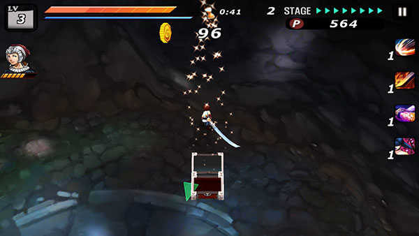如果手指点在屏幕上向某一方向快速滑动,而且该方向有敌人(非BOSS),角色就会发动绝杀技,瞬间杀死该名敌人并回复一定的血量,会消耗大量耐力