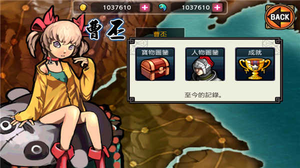 这个系统算是本作的收集与成就奖励系统,共有三个选项:宝物、人物以及成就。宝物是在每场战斗之后开宝箱可以随机获得,也可以用100金币进行搜索。收集满一栏(一栏四个)即可获得那栏最后对应的奖励项。人物则是你在平时游戏中进行佣兵搜索所找到的人物(连着一开始的李典,一共有30个不同的魏势力武将),算是一种变相的收集系统。而成就系统,达到一定目标则有相应的奖励,一般都是奖励金币,也有奖励蓝玉的。顺带吐槽一下,这里的曹丕是全游戏唯一一个小萝莉,而且偏向哥特风。