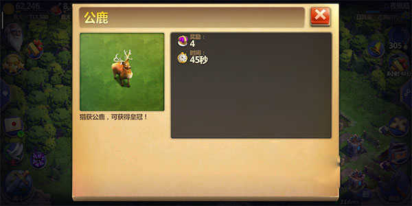 第一种办法是捕捉公鹿,系统会不定时在玩家的地盘刷新各种动物,其中猎获最稀有的公鹿即可得到4个皇冠。一般来说,公鹿需要3个空闲市民才可捕捉,捕捉时间为较长的45秒。