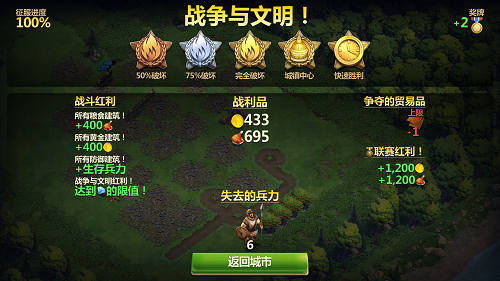 当玩家发展到青铜器时代时候便可以进行联机对战了,而联机对战则是玩家前中期获取资源的关键手段,因为在前期各位领主的防御都不是很强力,尽管获取的资源不多,但会增加联赛奖杯并获取联赛福利。所以在前期需要加强军事力量的发展,铁匠铺兵营等建筑重点培养,在战争中快速积累资源发展文明。