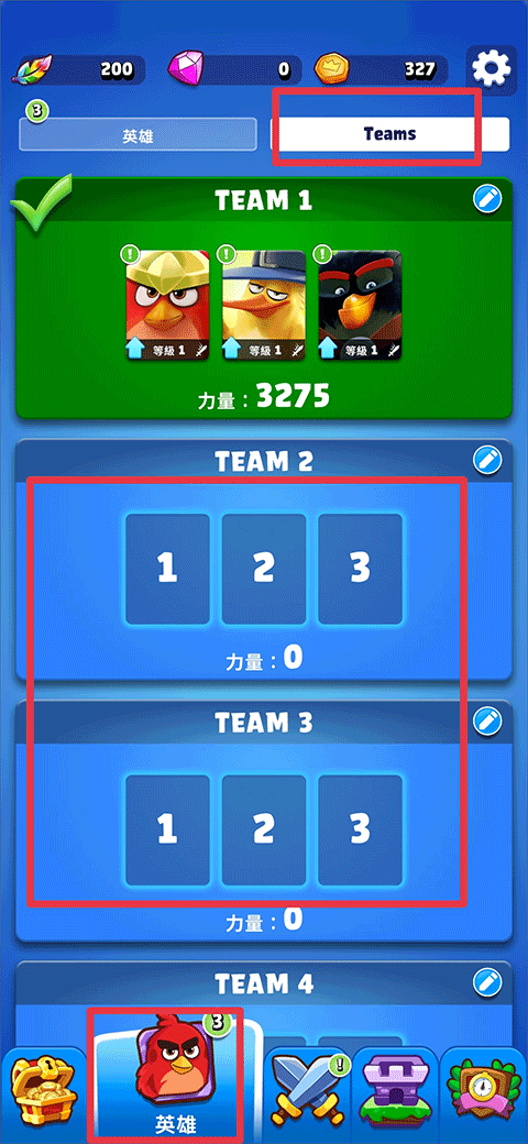 6、在英雄页面的teams阵容板块内,玩家可以随意将收集到的英雄来组建成一个队伍