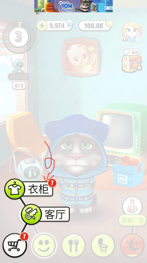 点击这个按键会带汤姆猫到客厅,在这你可以和他互动起来还可以和他一起玩游戏。