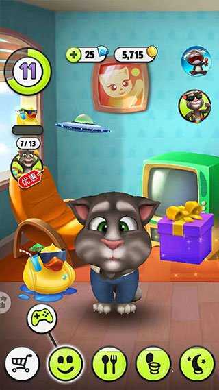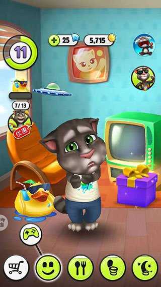 1、养育您专属的汤姆:和他玩游戏,喂他喜欢的食物,为他在床上盖好被子。