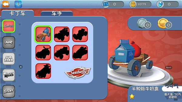 5、而在卡丁车界面,玩家们可以选择并解锁自己喜欢的卡丁车和角色;
