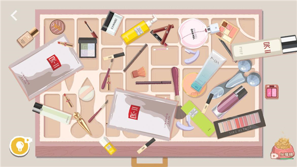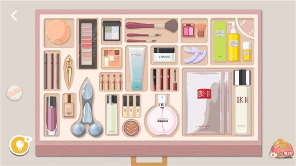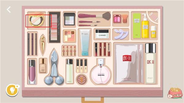 3、玩家成功所有化妆品放进去之后,会发现剩下粉扑无处安放,所以点击粉饼盒子打开。