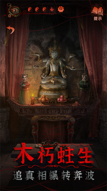 18、切换到二更场景,将【胭脂盒】放到木偶戏台上,拿到【梆子】,获得需要红线的提示。将【梆子】放到黑无常手里,用【锣棒】依次敲击锣、梆子、锣,切换到三更场景(无常贴脸高能)。点击进庙,点击元宝上的机关,解开机关拿到【一串铜钱】。