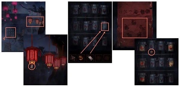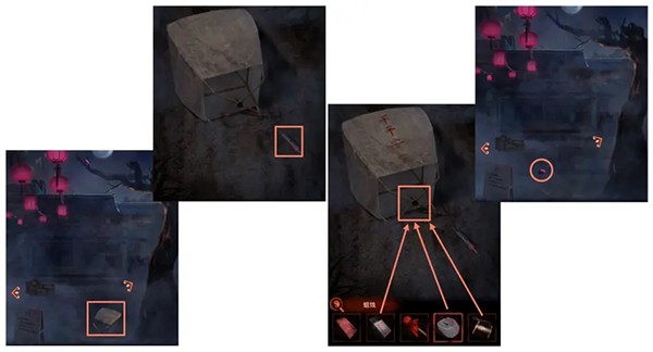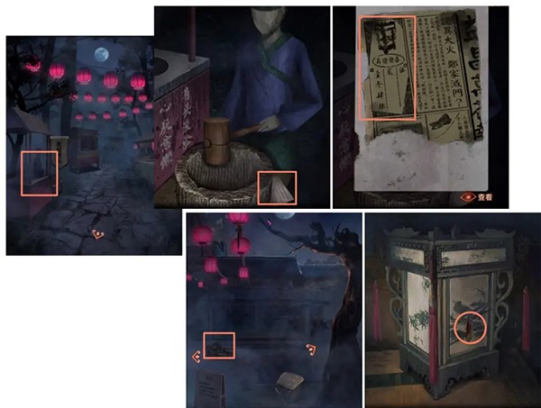 14、到一更的右边场景,点击第一个摊位,点击右下角的研究资料,点击纸张翻到背面。根据研究资料背面的报纸线索,按顺序点击灯笼的三条红绳,拿到【剪刀】和【纸元宝】。顺序:左中左左右左