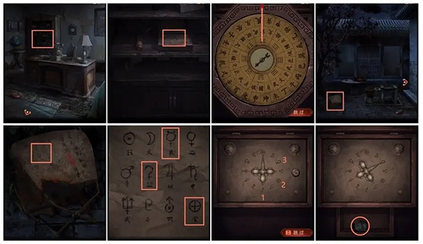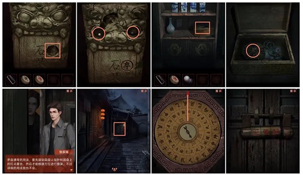 38、把【象棋卒】嵌在石敢当的凹槽中,拿到【黑白棋子】,将【黑白棋子】放在柜子上的黑白鱼盒子上,打开拿到【风水罗盘】。根据张辰瑞说的使用方式,在门锁前拿出【风水罗盘】,将指针和红点重合,红线竖下来对应的即为门锁密码。