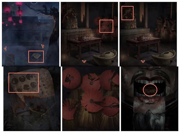 19、到右边场景点击右边的摊位,收银处放【一串铜钱】,拿到【特产礼盒】。将【特产礼盒】放在桌上后点击打开盖子,根据桌子上的书的第二页提示,将对应的食物放在对应的位置,打开神像的嘴巴。