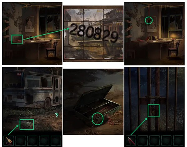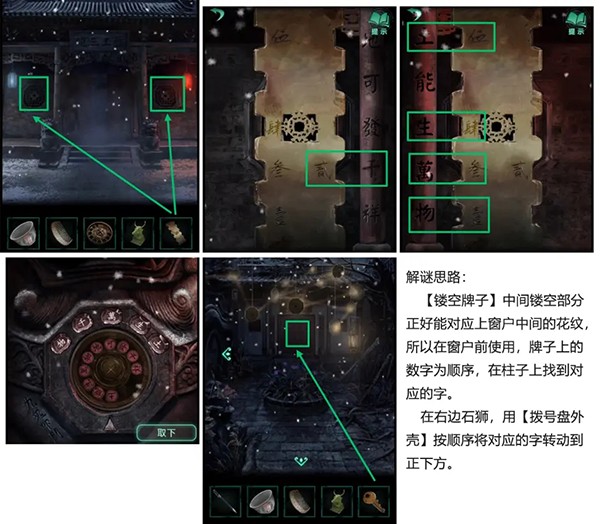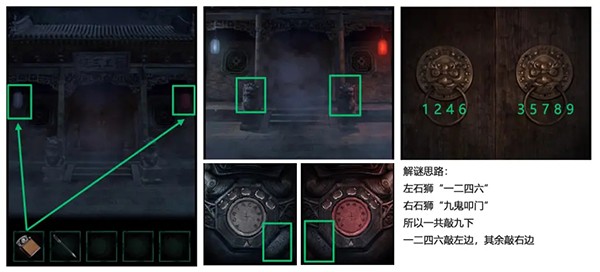 28、在大门的左右两个窗户处使用【镂空牌子】,获得线索提示,将【拨号盘外壳】装到右边石狮上,解开机关拿到【钥匙】,用【钥匙】打开门锁。