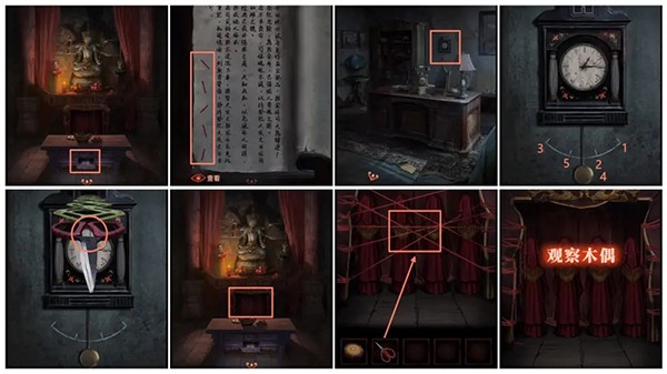 47、根据暗格里的书上的红线斜率,按顺序摆动钟摆(剪刀刺客),拿到【剪刀】。用【剪刀】剪开红绳,完成观察木偶。