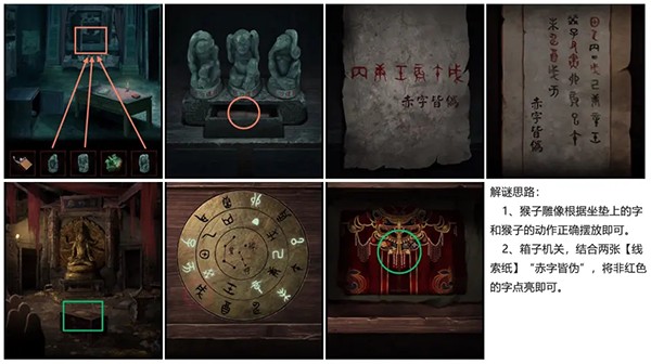 56、崔婉莺:根据《六转妙法录》和张辰瑞那边仙女壁画的颜色,调整好对应的宝珠颜色,拿到【玉印】。用【玉印】点击桌上的印泥,用【印泥玉印】在牌匾上盖印,拿到【猴子雕像】。