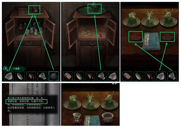 34、将【一朵花】放在左边柜子的茶壶里,用【空茶杯】盛茶,拿到【一杯茶】,用【空酒杯】在右边柜子上盛酒,拿到【一杯酒】。根据《告祖祭文》的提示,将【一杯茶】【一杯酒】放在对应的位置。