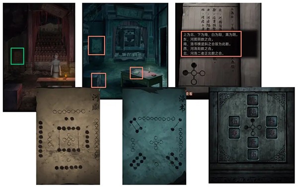 崔婉莺:进入千书斋,阅读桌上的《水神煞》,根据《水神煞》、河图和洛书,解开柜子机关。