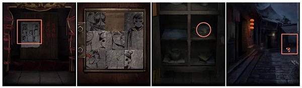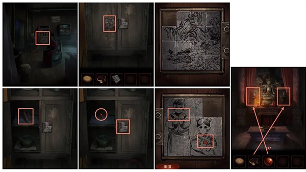 46、将【小方块】放在柜子的左边拼图机关上,完成拼图打开柜子,点击绣花鞋后拿到【宝珠】。根据右边拼图机关的图,将【环状饰品】和【宝珠】放在男童和女童纸人上,打开暗格。