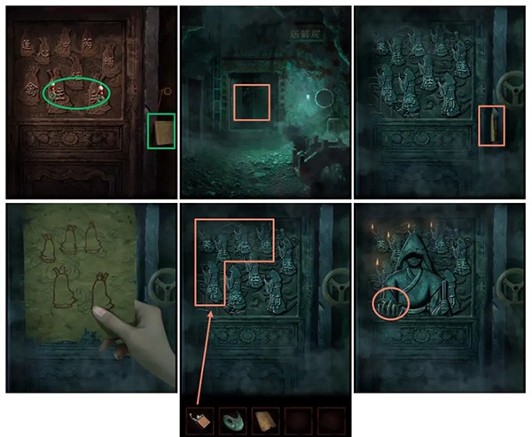 58、张辰瑞:点击石灯,用【多功能工具】锤爆石灯,拿到【凤冠】。根据《六转妙法录》,将【一对耳环】【凤冠】和【金丝嫁衣】给纸人穿戴上,点击桌上的笔写下姓名和生辰,再点击桌上的蜡烛点燃纸人。