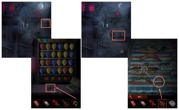 21、切换到二更场景,将【红绳】放到木偶戏台上,点击拿到【新娘木偶】,将【新娘木偶】挂到对应谜语的灯笼下,地上拿到【旧时代报纸】。根据【请柬】和【旧时代报纸】的图案提示,解开花轿里的密码盒(镜中纸人高能)。