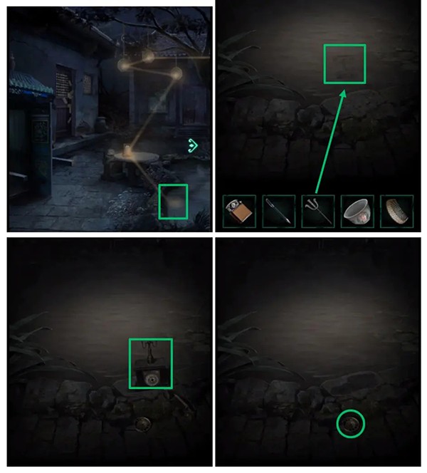 23、到左边场景过剧情,点击窗户,用【红圆珠笔】捅破窗户后,从崔婉莺手里拿到【线索纸】。点击院子的假山,根据【线索纸】的提示,按顺序点击假山上的物件,拿到【三叉戟】。