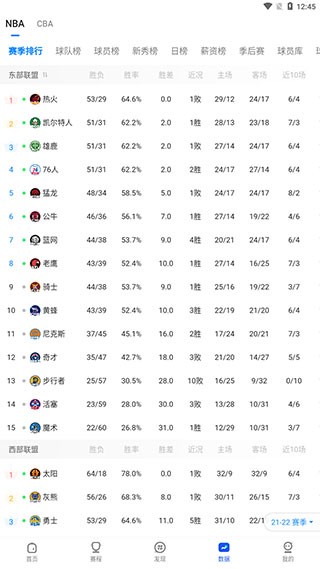 2、数据中心主要提供东西球队的排行榜,球员的得分榜、助攻榜、盖帽榜、抢断榜、篮板榜、失误等数据排行。