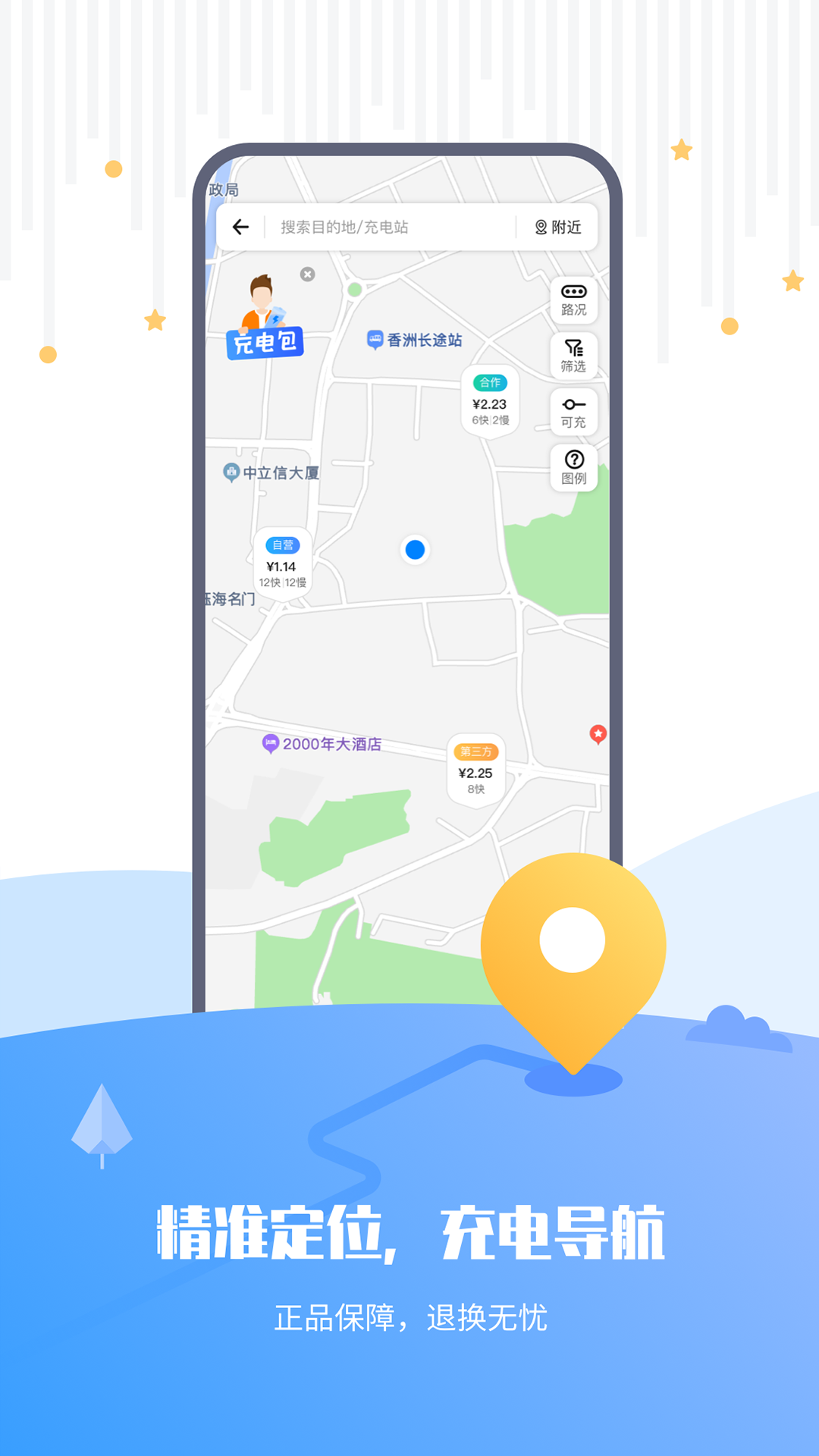 1、一键进入指定的充电地点,并与高德、百度等第三方地图合作,实现对充电点的定位。