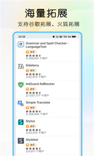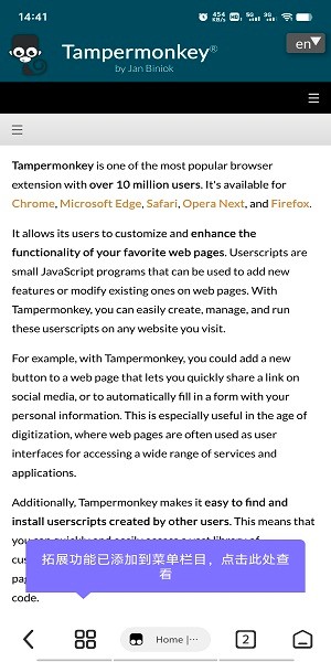1、【浏览器拓展】采用通用WebExtenxion转换,使他同时支持了谷歌拓展Crx以及火狐Xpi,带来了很高的可玩性。你可以使用Tampermonkey安装好玩的脚本,也可以使用Ruffle玩Flash游戏。