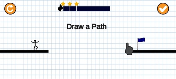 2、游戏第一关,玩家需要点击屏幕绘制长线,帮助火柴人跨过障碍,玩家要注意笔画长度是有限的,越短获得的关卡星星越多。