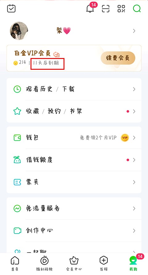 1、在“我的”页面,点击上方会员栏上的“到期时间”;