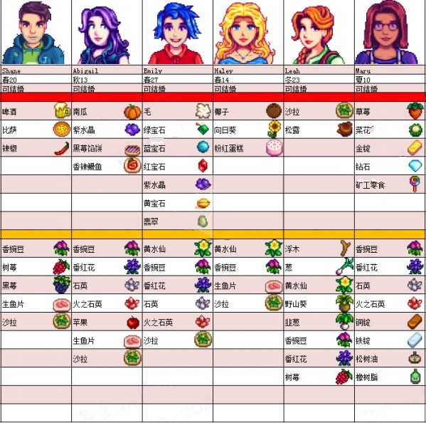 3、哈维,小镇里的医生,梦想当飞行员,但是恐高,最喜欢能量餐、龙虾浓汤、松露油、幸运兔脚、咖啡,喜欢所有的宝石、料理、工业品、蔬菜、水果,不喜欢所有的手工艺品、小麦粉、松焦油、黏土、石头,讨厌垃圾、野草、罂粟等。
