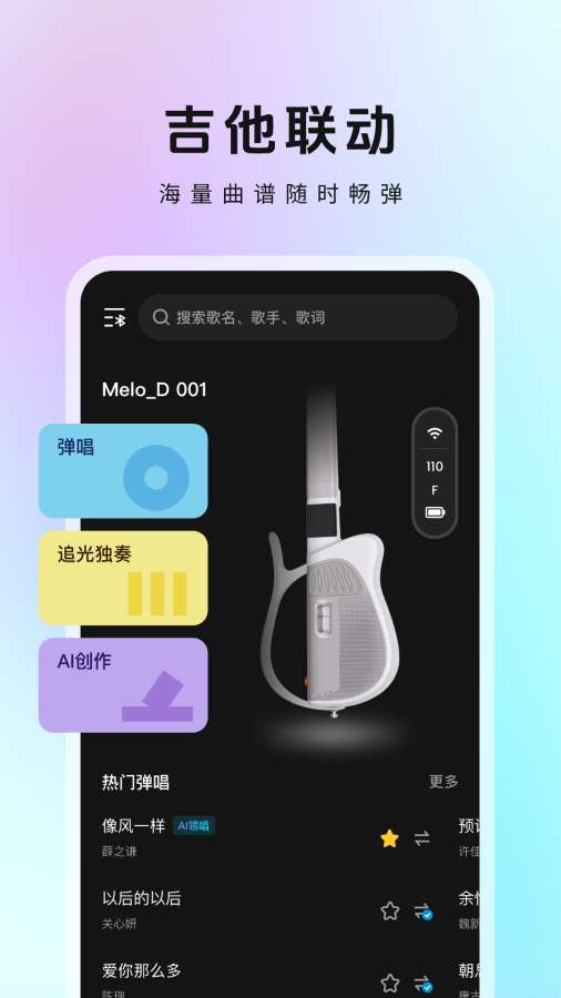 1.快速搜索并连接周围的 Melo-D 智能吉他。