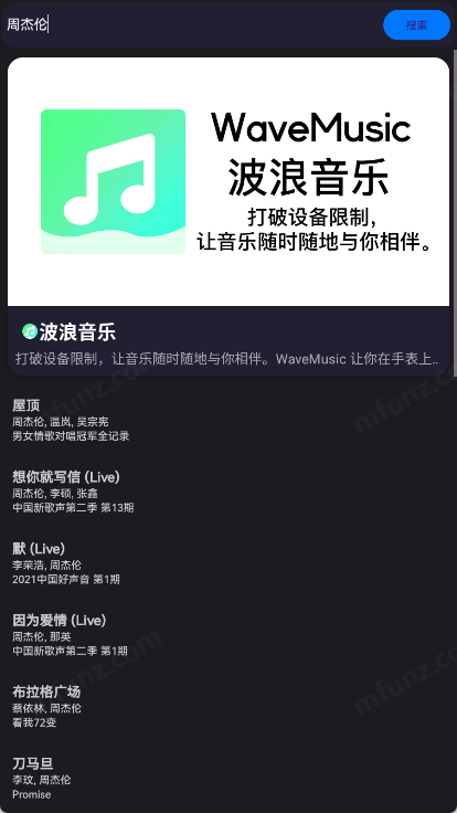 波浪音乐软件最新版内置国内外众多歌手、组合的歌曲以及合集,点击即可免费播放。在首页右上角设置了搜索按钮,输入歌曲或歌手名字即可快速查找,在播放界面可随时暂停/继续播放、切歌以及修改播放模式!