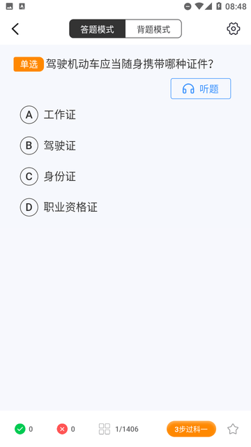 1、打开应用就能进入顺序练习,对题目依次进行测试练习;