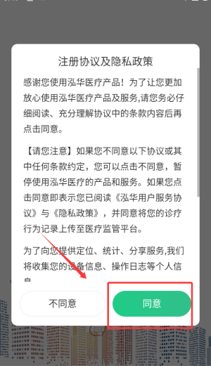 1、轻点同意协议,迅速进入应用界面,开启便捷医疗服务新体验。