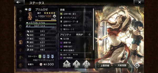 舞娘,也是原作角色之一。舞娘的主要职能是给队友上buff,这点普姐做到了,有提升20%双攻的buff。也有本职业的乱四连扇可以削盾。