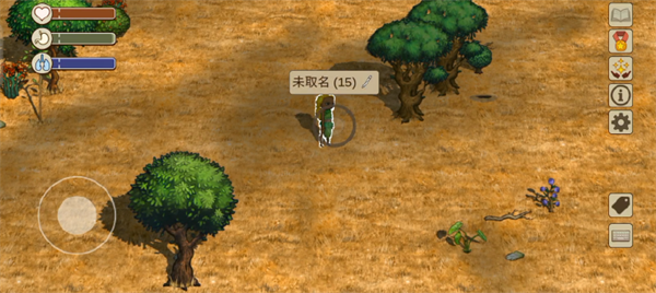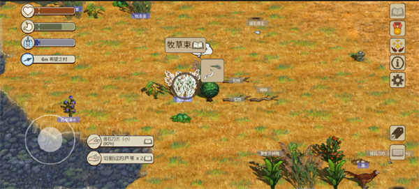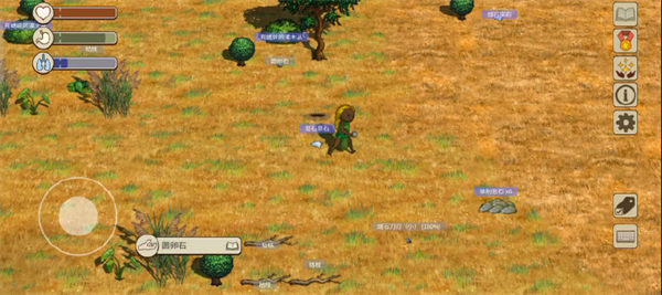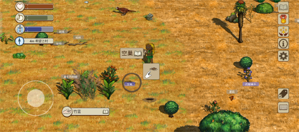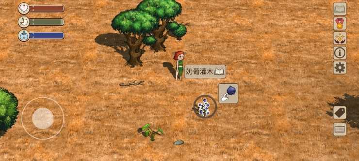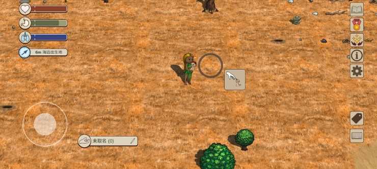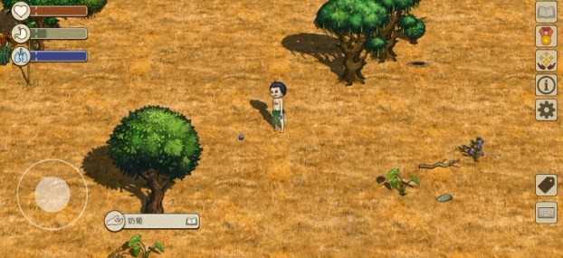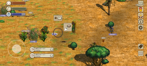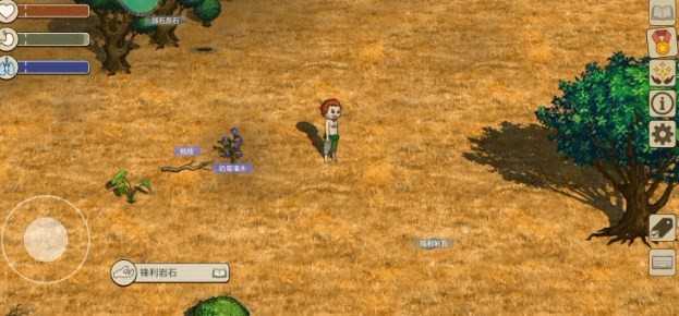 打开右下角标签功能,部分动植物的名称就会显示。名称的背景有灰色和紫色两种。灰色背景道具为一般的道具,可以捡起手持;紫色背景的道具交互后会产生新的道具,如有果实的果树、有蛋的鸟巢都是紫色背景可交互,交互完成后可以得到能食用的果实和蛋。