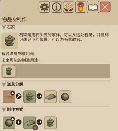 道具分解中出现的手掌图标,意思是人物需要手持状态下再和石冢交互。箭头右边的两个物品就是石冢分解之后产生的原材料。最下方的制作方式里手掌图标,同样是需要人物手持原石和6个重叠的石块进行交互,制作而成。