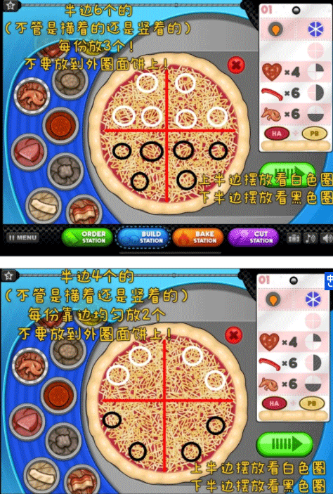 5、半边铺6个食材的,每一份放3个!(不管是横着放6个还是竖着放6个的)不要放到外圈面饼上!(图4有示意图可参考)