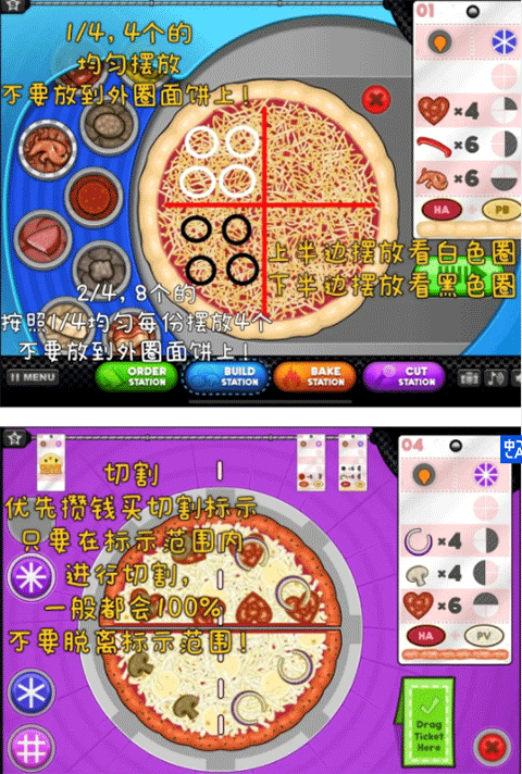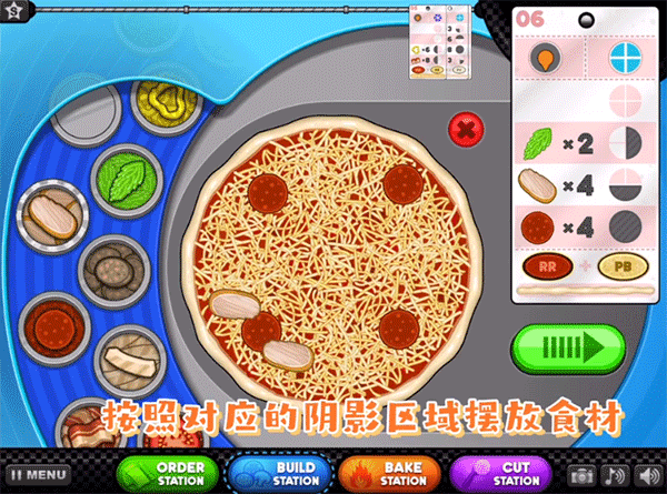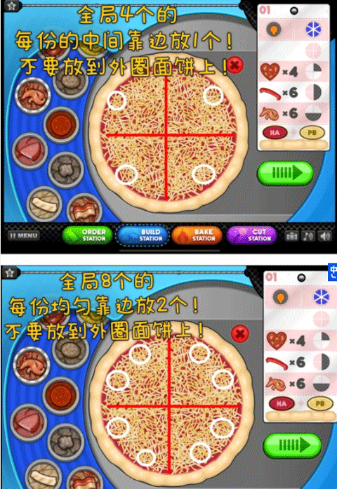 1、酱料和芝士都要等到虚线到达最大处,靠近外圈那里,再放到披萨饼上!不然会扣分哦!