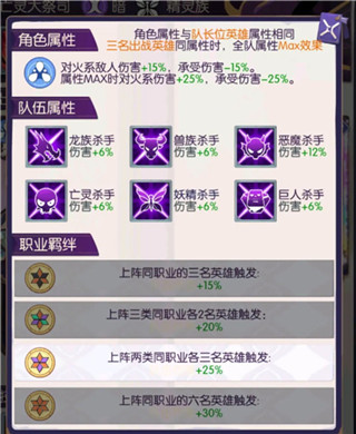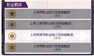 在邂逅在迷宫游戏中进入主楼层,点击左下方职业羁绊,会显示本游戏战斗的核心机制——角色属性、队伍属性、职业羁绊