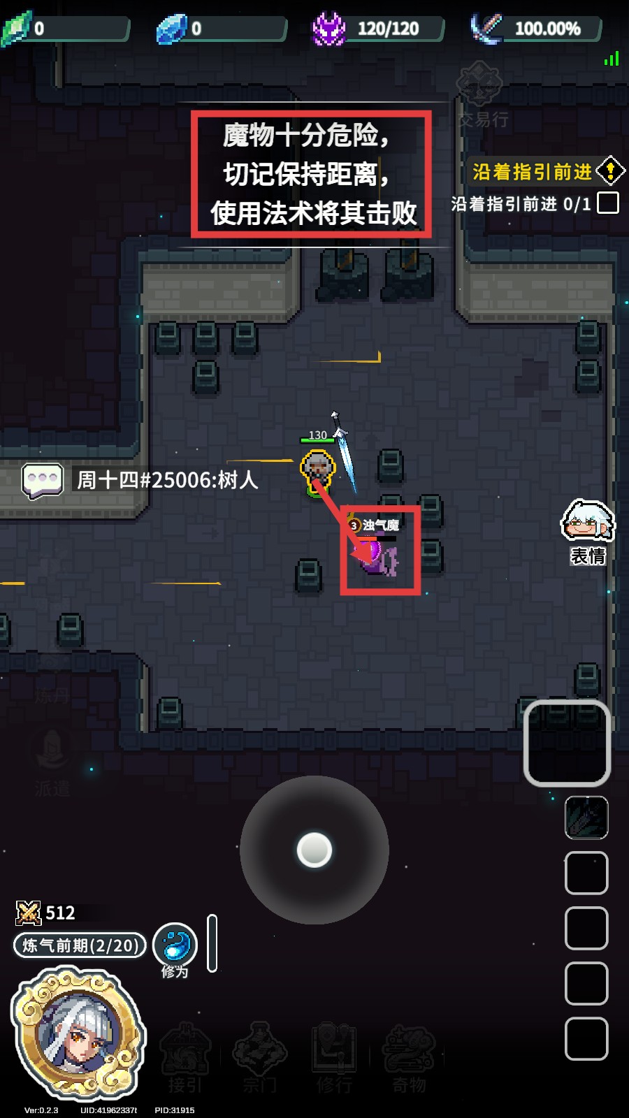3、遇到魔物【浊气魔】时,牢记“魔物十分危险,切记保持距离”,使用法术攻击,将其击败,保障自身安全。