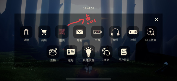 点击界面的右上角可以呼出系统菜单,我们可以在这里点击回到“遇境”,遇境是我们的大本营,我们可以通过遇境前往去过的每一关。我们在遇境的初始位置,脚下站着的地方就是“群星”,在这里我们可以找到游戏中遇到的朋友。抬头看天空可以在天空中的星辰里呼唤我们遇到过的先祖。在后方的3个小石偶那里,我们可以通过二维码联系邀请现实中的好友。