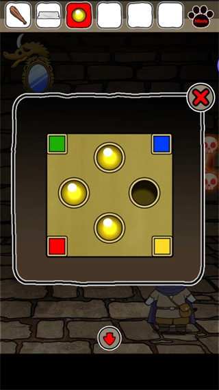 3、往右2次前往有镜子的房间,把黄色宝石装在有飞龙的黄色盒子上,打开底座获得棍棒;