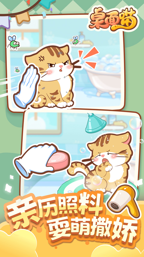 用户可以给猫咪喂食、洗漫、梳毛等,照顾猫咪的日常生活。