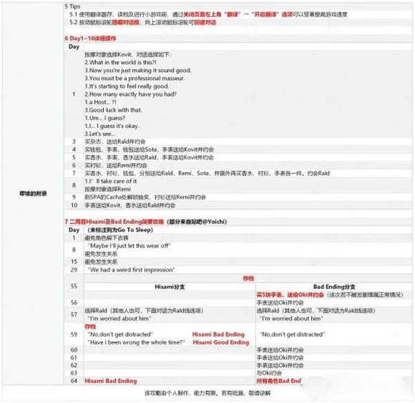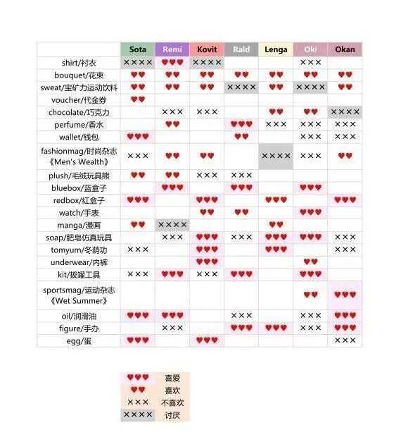 - 关于送礼,由于我一周目主力攻略几个精肉兄贵,目前已知的是Kovit和Okan喜欢Men's Health杂志,Boss喜欢香水,Oki最爱蓝色盒子、喜欢手表,Sota最爱玩具熊、喜欢漫画。