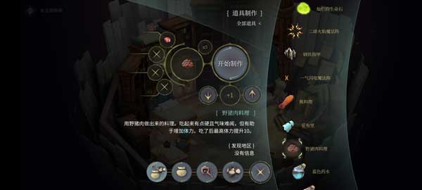 野猪肉料理:三个野猪肉制作而成,游戏前期提高体力上限的重要道具,一次十点体力上限